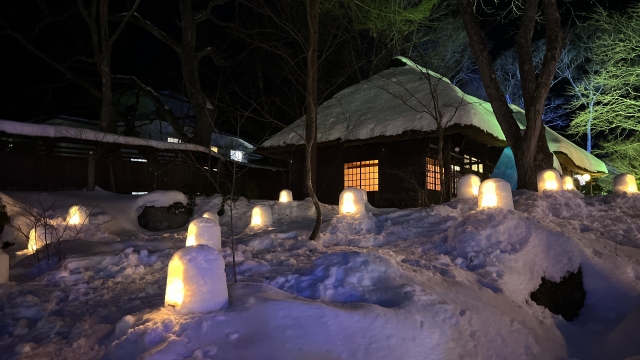 絵に描かれたような、真っ白な綺麗な雪に覆われた雪化粧の「茅葺屋根」や、白銀の世界に沢山の灯りを灯す「ミニかまくら」が幻想的な空間を作りだし観光客を魅了します。